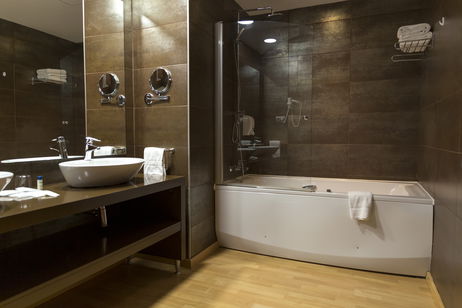 El baño, totalmente equipado, cuenta con lavamanos doble y bañera de hidromasaje (1,80x1), albornoz y zapatillas.