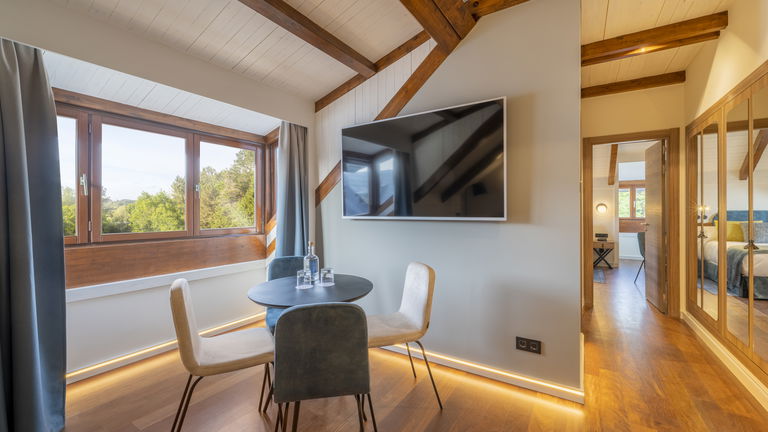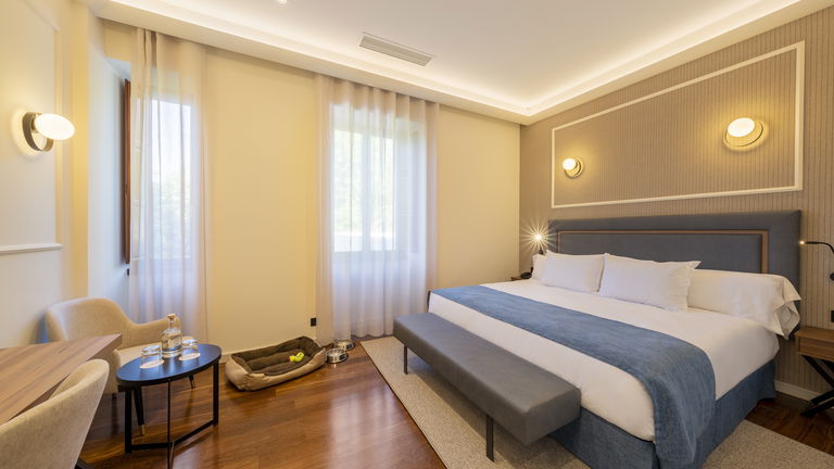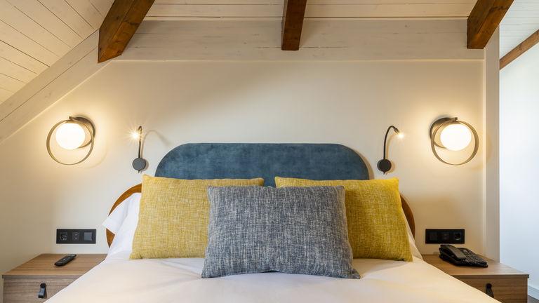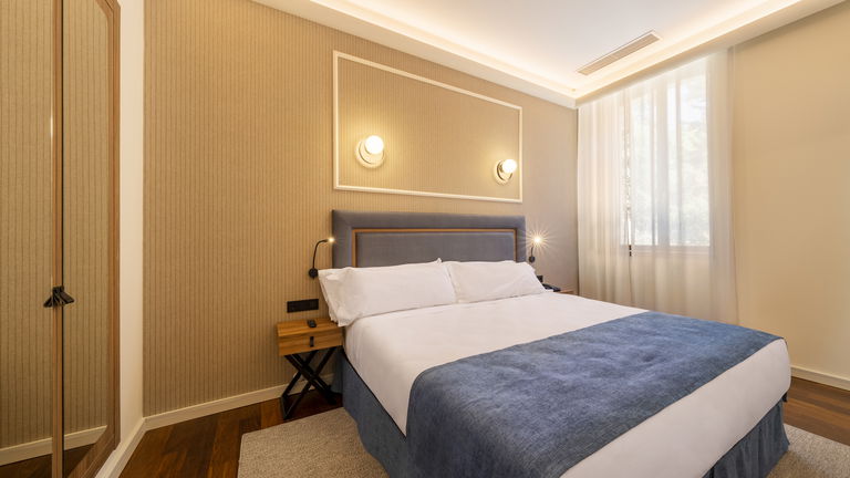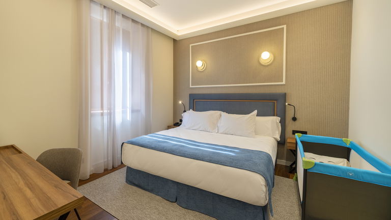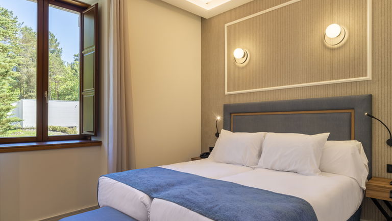 Habitación doble que puede tener una cama de 1,5m, dos camas de 1 m o bien dos camas de 090 m y cama supletoria, perfecta para familias. La cama de tamaño matrimonial es cómoda y acogedora, ofreciendo un sueño reparador para los huéspedes. La decoración es elegante y moderna, con tonos suaves y detalles refinados que crean un ambiente tranquilo y relajante. La habitación cuenta con todas las comodidades necesarias para una estancia agradable, como televisión, aire acondicionado y un baño privado con toallas y artículos de aseo.