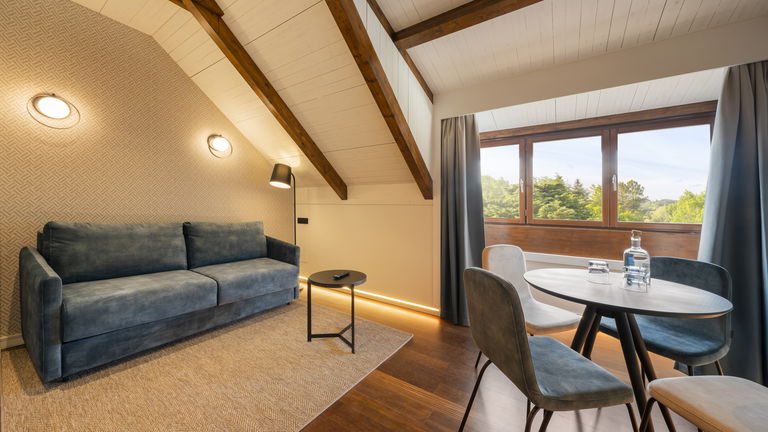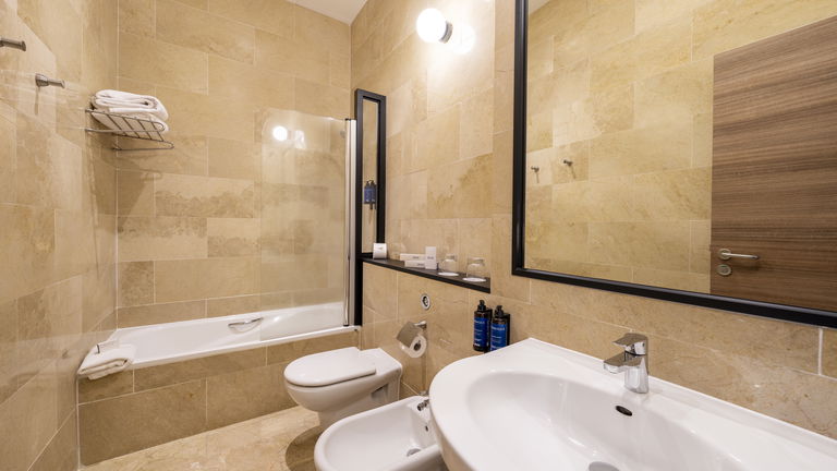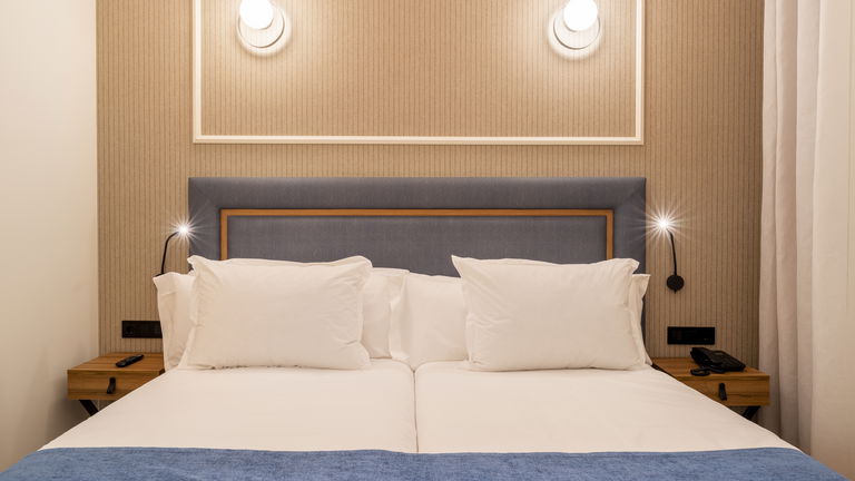 Habitación doble con dos camas de 1m y sofá cama, perfecta para familias. La cama de tamaño matrimonial es cómoda y acogedora, ofreciendo un sueño reparador para los huéspedes. La decoración es elegante y moderna, con tonos suaves y detalles refinados que crean un ambiente tranquilo y relajante. La habitación cuenta con todas las comodidades necesarias para una estancia agradable, como televisión, aire acondicionado y un baño privado con toallas y artículos de aseo.
